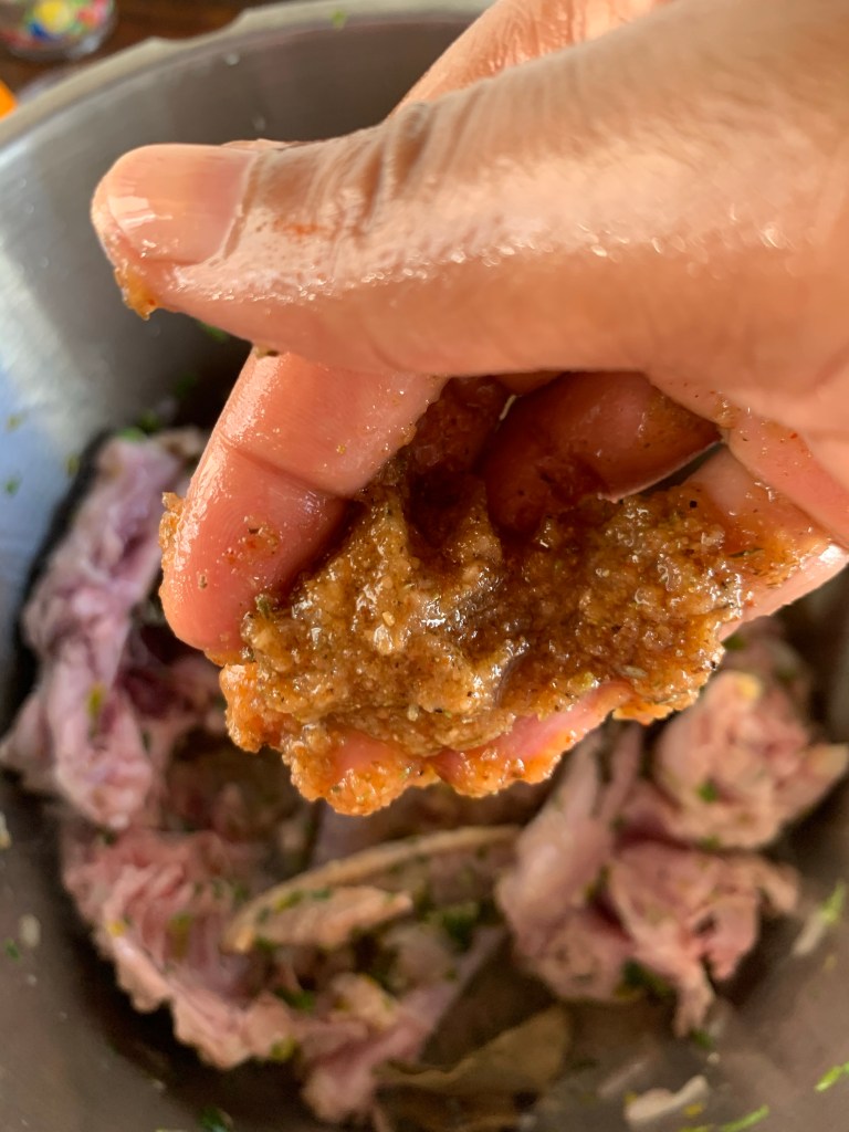 Une cocotte minute au feu, y mettre de l’huile puis rajouter la pintade coupée en morceaux et lavée, la pâte d’épices, les légumes verts, l’ail et le 2e oignon 🧅 tous finement découpés, le thym frais et les feuilles de laurier. Remuer lentement et laisser frémir.